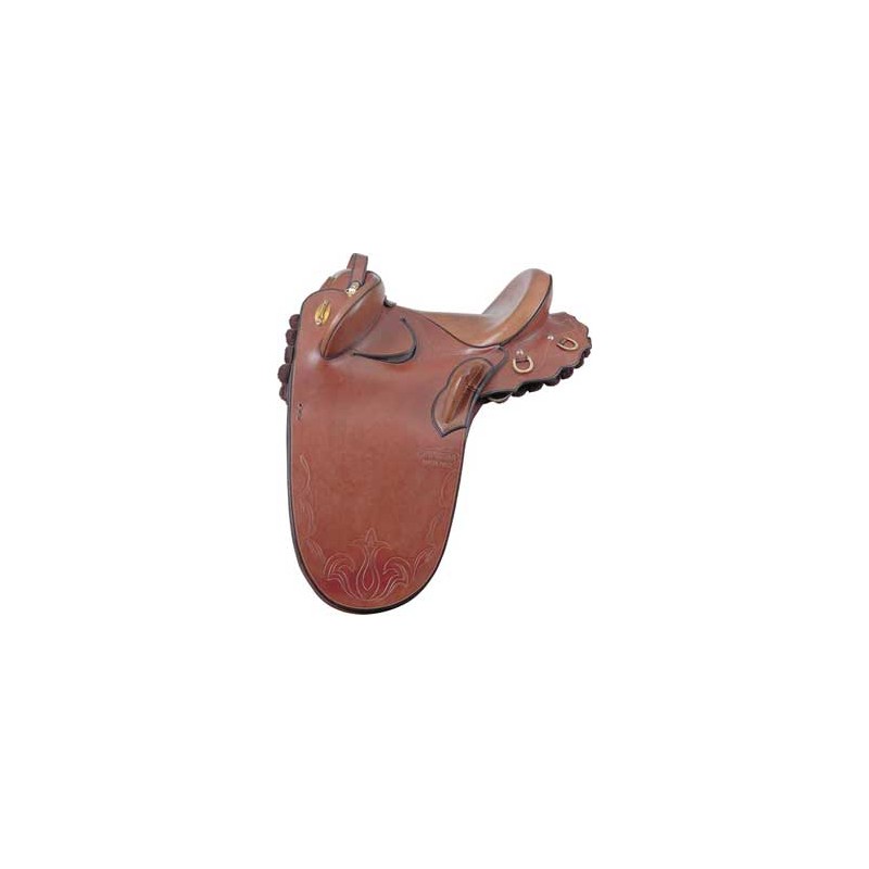 Super heavy duty construction, this saddle is built to last. The deep wide seat offers a new comfort level for the rider, while the extended panels offer better weight distribution over the horses back, less pounds per square inch. Comes standard with thigh pads (for heavy duty trail riding or horse training) and western rigging. Most suited for horses with a wide flat back and lower withers. Available with either the thick wool felt panel as illustrated or a genuine Merino sheepskin panel (all in-stock saddles have the sheepskin panel). Shown with optional monkey strap above the kneepads.