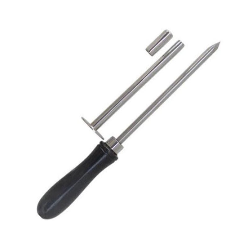 The flat-to-round shape has made this Wooden Hande trocar very popular for venting animal gas accumulations. Extremely sharp point, giving way to three angled flat sides, pierces the hide easily without an pre-incision. Use the round irrigating cannula for stomach irrigation or to introduce medications. Includes stainless steel cannula and protector cap.