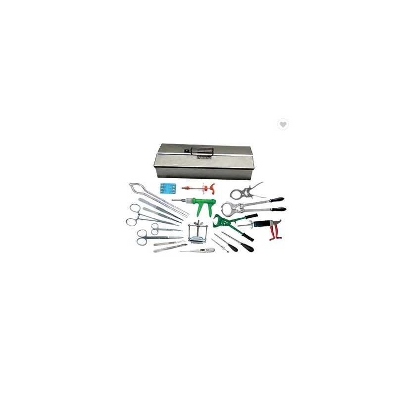 1, Castration Plier Small 1, Castration Plier Large 1, Mouth Gage Vernals 1, Mouth Gage Butler 1, Trocar and Canulla Small 1, Trocar and Canulla Large 1, Artery Forceps 14 cm 1, Dressing Forceps 14 cm + 20 cm 1, Scissors Straight 14 cm + Curved 14 cm 1, Digital Thermometer 1, Teat Dilator 1, Hoof Cutter 40 cm 1, Suture Needle Pack of 10 1, Twitch 1, Balplex Syringe 10 ml 2, Needles 1 1/2 " , 3/4 " ( 12 PCS ) 1,Automatic Drencher 30 ml 1, Surgical Knife Handle No. 3 1, Surgical Knife Handle No. 4 1, Blade Pack of 10 No. 10 1, Blade Pack of 10 No. 20 Complete Kit in Stainless Steel Box Wth Removable Tray ...